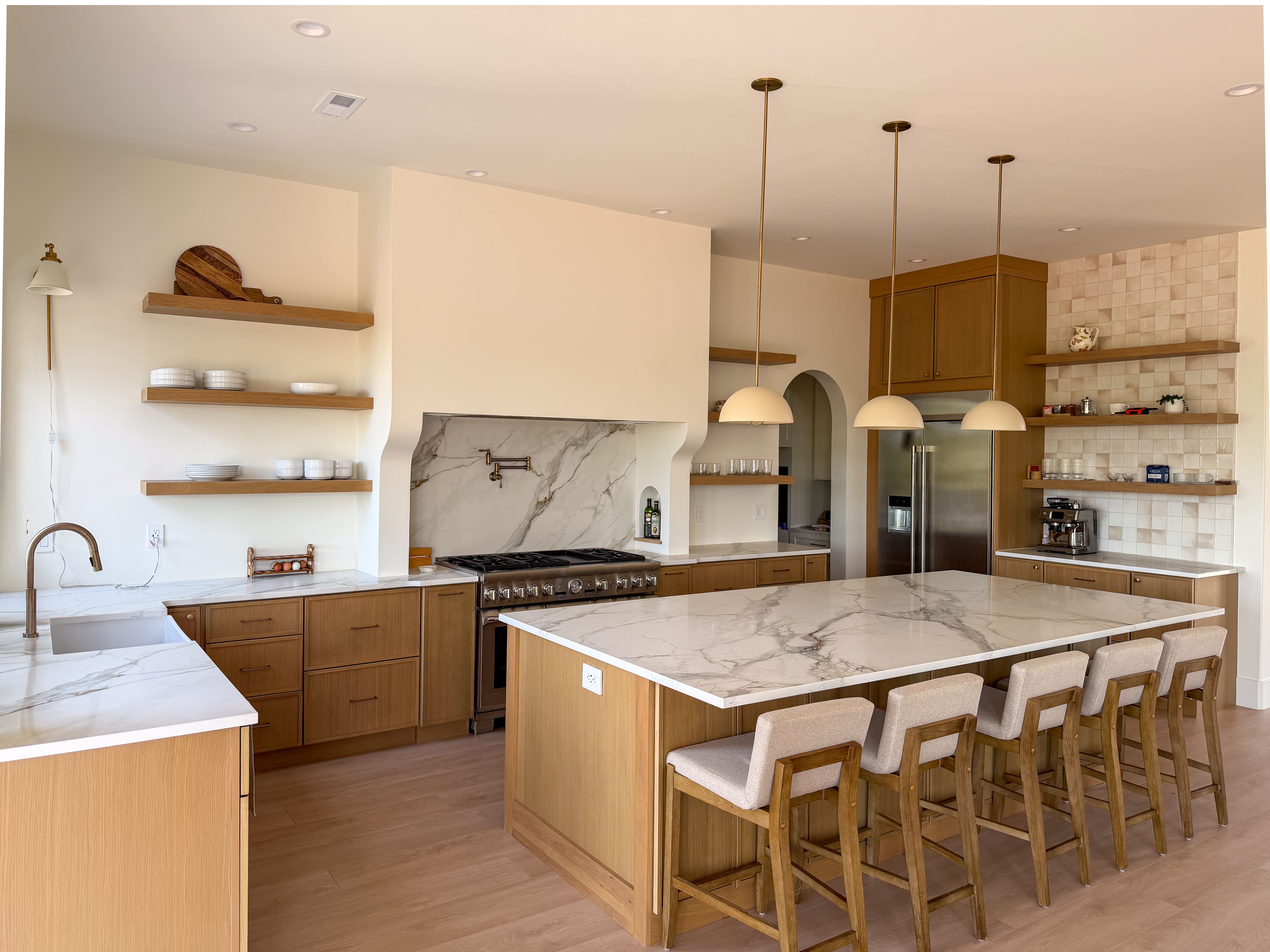 This kitchen features a full custom installation in 3CM Calacatta Royale Quartz, including perimeter countertops, full backsplash, island, and window sill. The bright white stone pairs beautifully with natural wood cabinetry, creating a clean, warm, and modern look with a timeless luxury feel.